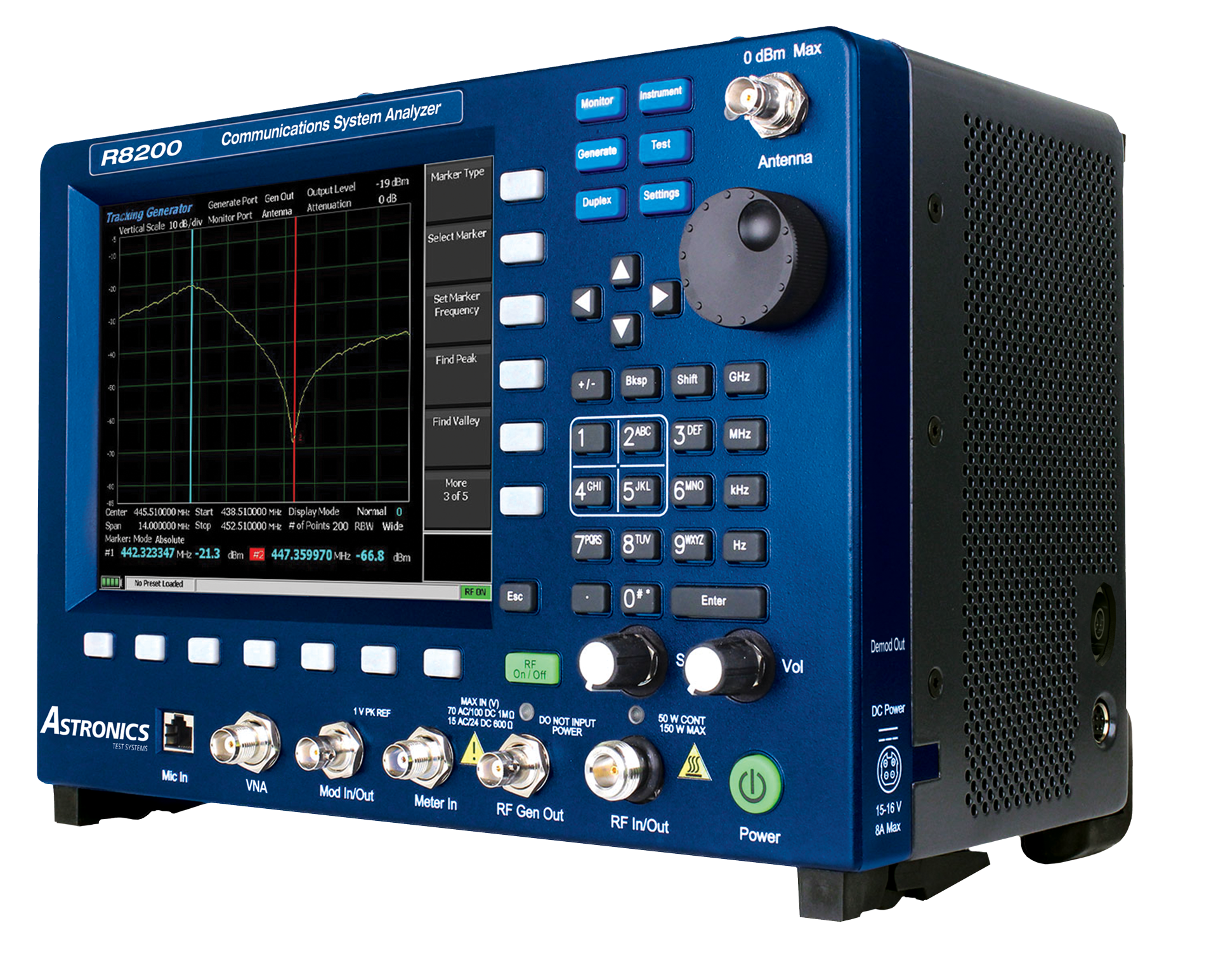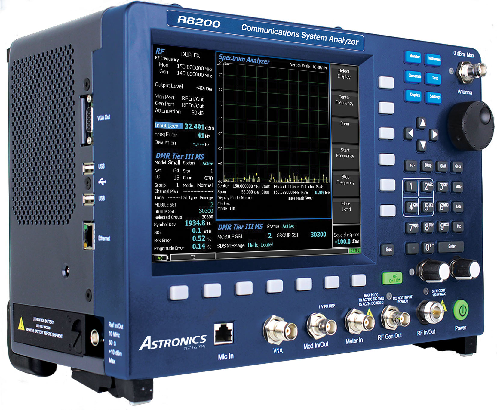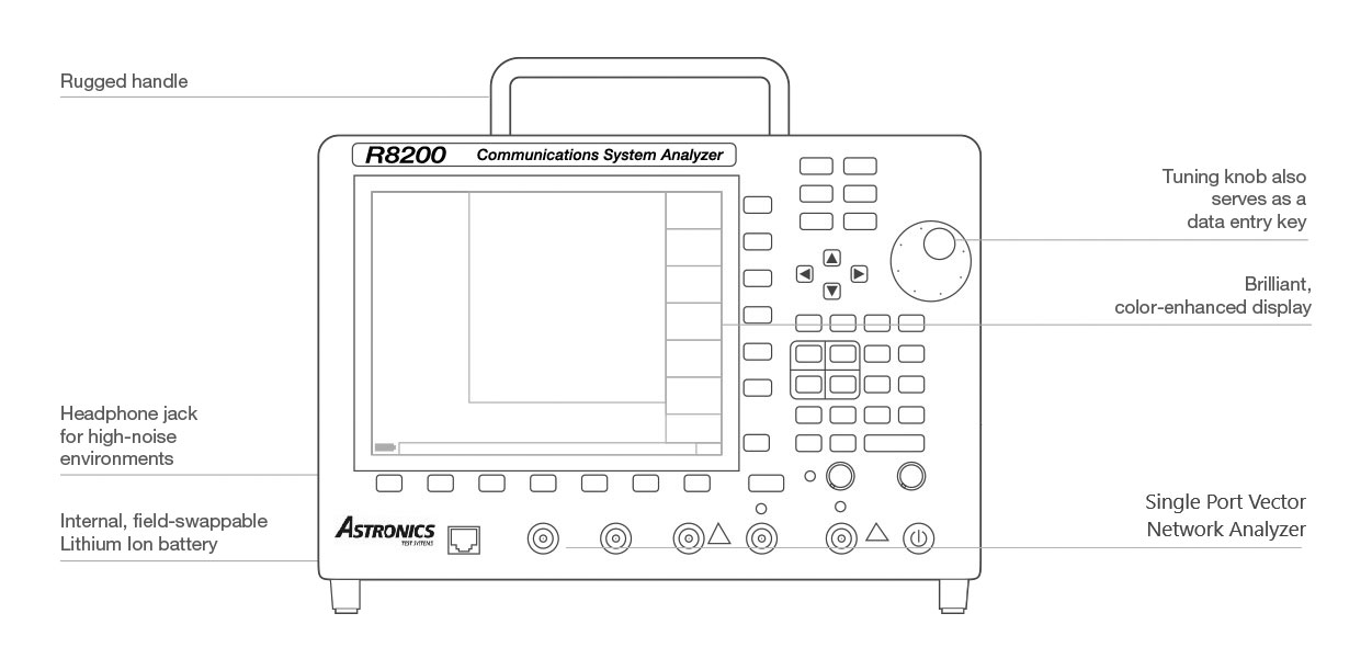 The R8200 from Astronics Test Systems represents a major step in the evolution of the Land Mobile Radio service monitor. The R8200 combines comprehensive digital and analog LMR testing with the ability to measure important RF network characteristics such as Return Loss, VSWR and Phase. The R8200 is also the only service monitor with the ability to display RF parameters in a Smith Chart for more complicated network analysis.